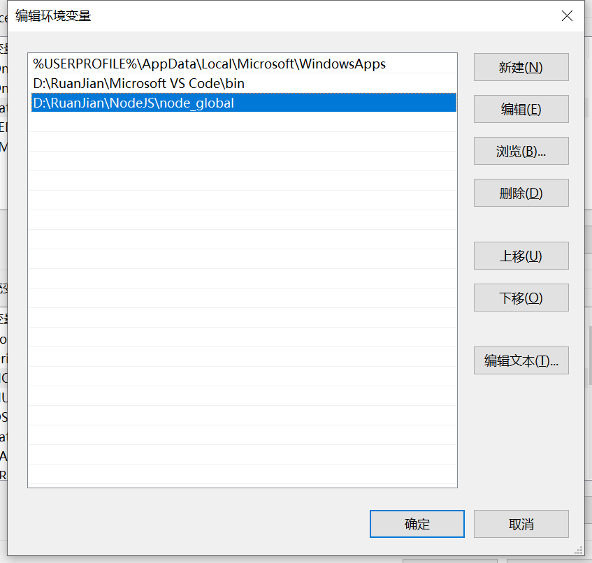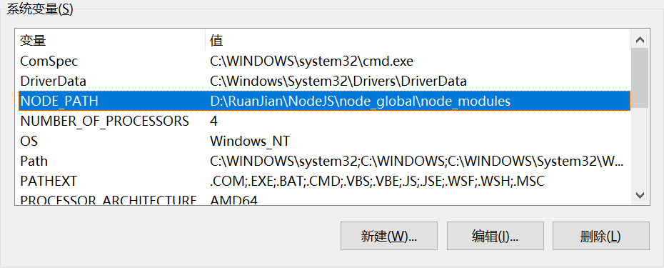 NODE_PATH,变量值:D:\RuanJian\NodeJS\node_global\node_modules;编辑用户变量的