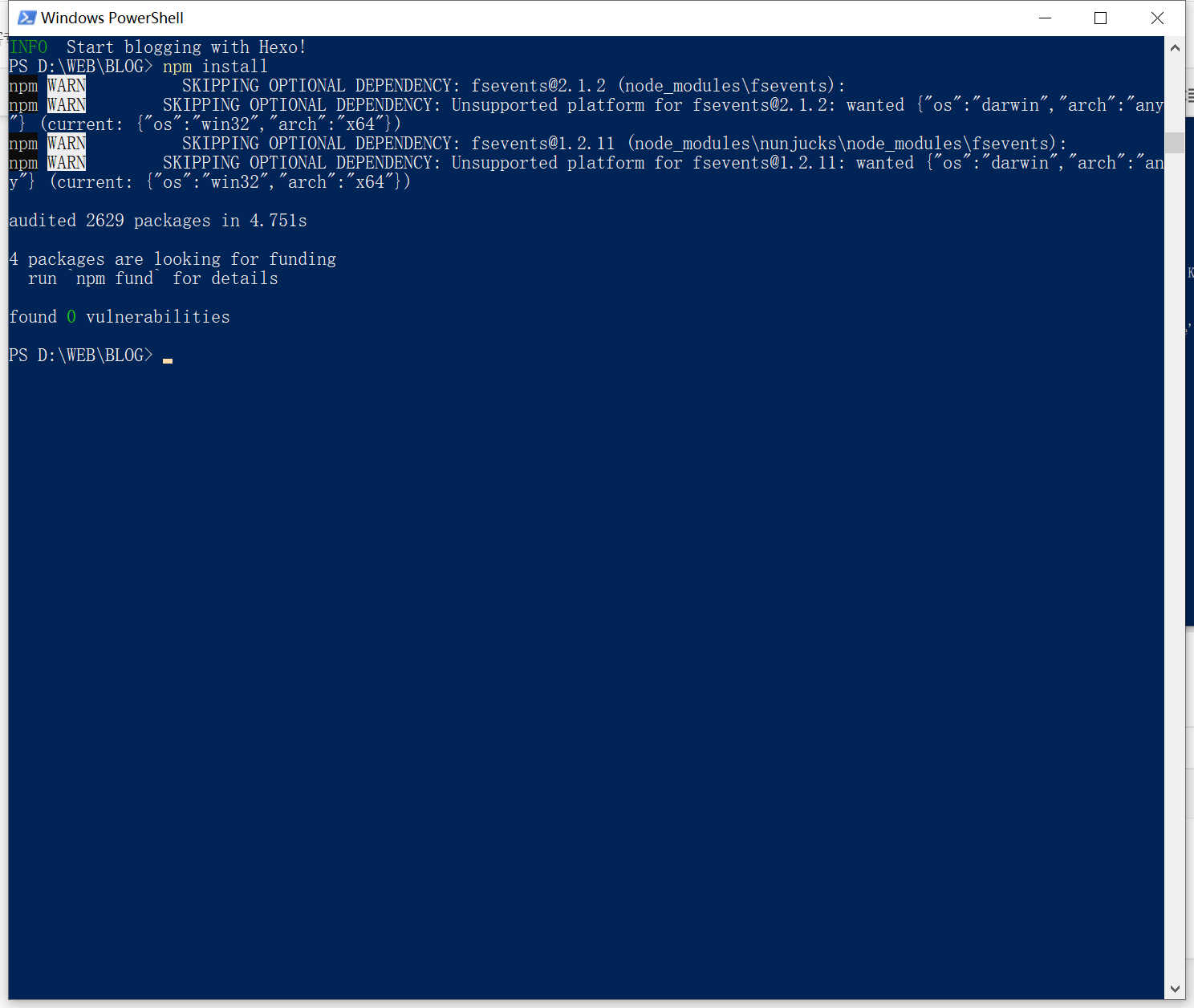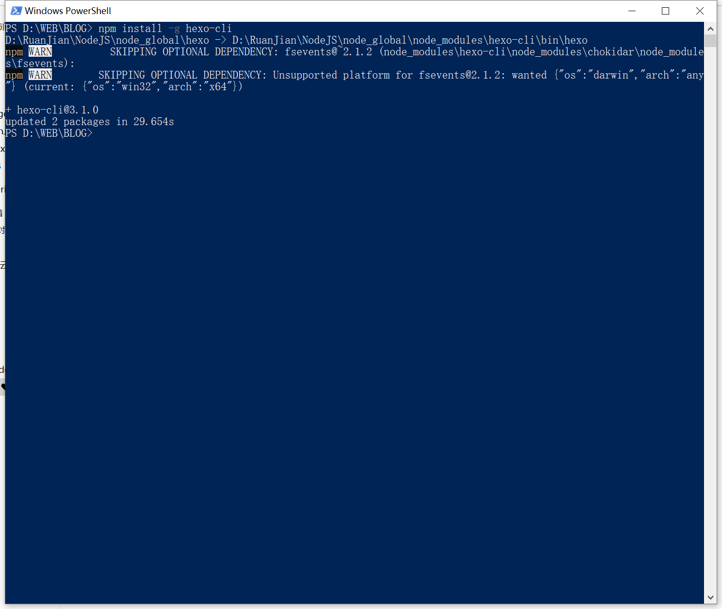 点在此处打开PowerShell窗口(S) ,使用npm命令来安装Hexo安装后会有几个WARN报错,直接无视它。