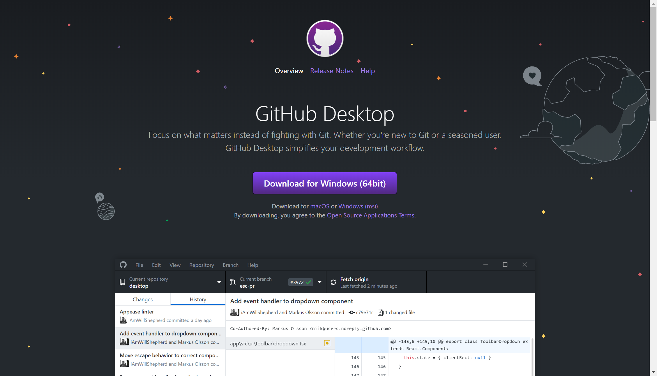 另一个简单的方法是安装 GitHub Desktop。 该安装程序包含图形化和命令行版本的 Git。 它也能支持 Powershell,提供了稳定的凭证缓存和健全的换行设置。 稍后我们会对这方面有更多了解,现在只要一句话就够了,这些都是你所需要的。 你可以在 GitHub for Windows 网站下载。